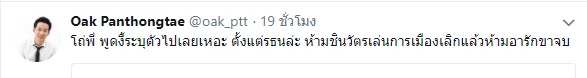 21 ก.ค.61 ผู้สื่อข่าวรายงานว่า ภายหลังนายพานทองแท้ ชินวัตร บุตรชายนายทักษิณ ชินวัตร อดีตนายกรัฐมนตรี ทวิตข้อความว่า “โถ่พี่ พูดงี้ระบุตัวไปเลยเหอะ ตั้งแต่รธน.ล่ะ ห้ามชินวัตรเล่นการเมืองเลิกแล้วห้ามอารักขาจบ”