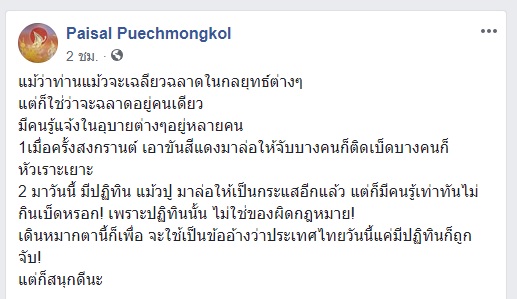 ทั้งนี้ นายไพศาล โพสต์ข้อความว่า แม้ว่าท่านแม้วจะเฉลียวฉลาดในกลยุทธ์ต่างๆ แต่ก็ใช่ว่าจะฉลาดอยู่คนเดียว มีคนรู้แจ้งในอุบายต่างๆอยู่หลายคน
