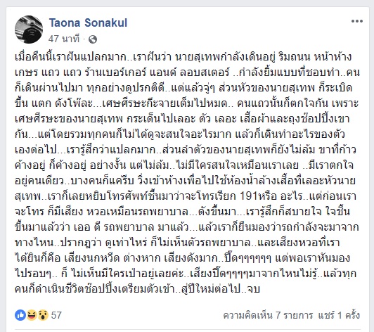 เมื่อคืนนี้เราฝันแปลกมาก..เราฝันว่า นายสุเทพกำลังเดินอยู่ ริมถนน หน้าห้างเกษร แถว แถว ร้านเบอร์เกอร์ แอนด์ ลอบสเตอร์ ..กำลังยิ้มแบบที่ชอบทำ..คนก็เดินผ่านไปมา ทุกอย่างดูปรกติดี..