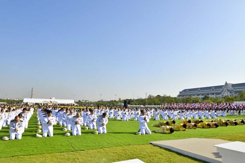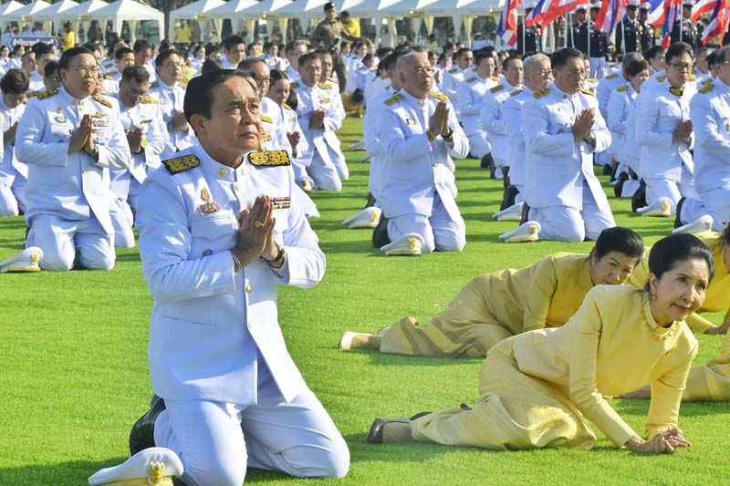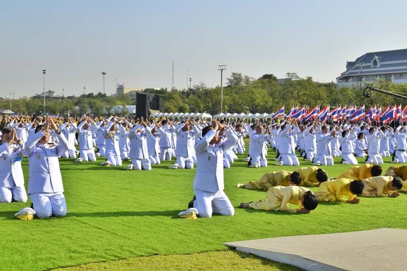 จากนั้น นายกรัฐมนตรี พร้อมผู้ร่วมพิธีถวายบังคม 3 ครั้ง ภริยานายกรัฐมนตรี นำเหล่าสุภาพสตรี หมอบกราบ เป็นอันเสร็จพิธี