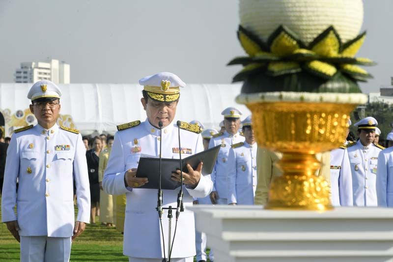 โดยนายกรัฐมนตรีกล่าวน้อมรำลึกในพระมหากรุณาธิคุณ เนื่องในโอกาสวันคล้ายวันเฉลิมพระชนมพรรษาพระบาทสมเด็จพระปรมินทรมหาภูมิพลอดุลยเดช บรมนาถบพิตร ความว่า เนื่องในวันคล้ายวันเฉลิมพระชนมพรรษาของพระบาทสมเด็จพระปรมินทรมหาภูมิพลอดุลยเดช บรมนาถบพิตร ในวันนี้ ข้าพระพุทธเจ้า พลเอกประยุทธ์ จันทร์โอชา นายกรัฐมนตรี พร้อมด้วยคณะรัฐมนตรี ข้าราชการ และพสกนิกรชาวไทยทุกหมู่เหล่า ที่ได้มาชุมนุมกันอย่างพร้อมเพรียง ณ ที่แห่งนี้ ล้วนมีจิตใจตั้งมั่นในกตัญญูกตเวทิตาน้อมรำลึกถึงพระมหากรุณาธิคุณอันหาที่สุดมิได้