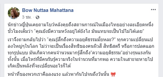 21 ธ.ค.61 น.ส.ณัฏฐา มหัทธนา หรือ “โบว์” แกนนำกลุ่มคนอยากเลือกตั้ง โพสต์ความเห็นผ่านเฟซบุ๊ค Bow Nuttaa Mahattana ระบุว่า “นักข่าวญี่ปุ่นเคยถามโบว์หลังคุยถึงสถานการณ์ในเมืองไทยอย่างละเอียดหนึ่งชั่วโมงเต็มว่า “คุณยังมีความหวังอยู่ได้ยังไง มันแทบจะเป็นไปไม่ได้เลย”