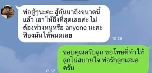 ขณะที่นายวัฒนา ตอบว่า “ขอบคุณครับลูก ขอโทษที่ทำให้ลูกไม่สบายใจ พ่อรักลูกเสมอครับ”