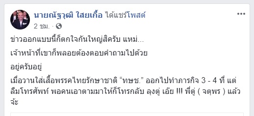 10 ก.พ.62 นายณัฐวุฒิ ใสยเกื้อ ประธานคณะกรรมการรณรงค์หาเสียงและกรรมการบริหารพรรคไทยรักษาชาติ (ทษช.) โพสต์เฟซบุ๊ก “นายณัฐวุฒิ ใสยเกื้อ” ชี้แจงกรณีข่าวนายจตุพร พรหมพันธุ์ ผู้ช่วยหาเสียงพรรคเพื่อชาติ และประธานแนวร่วมประชาธิปไตยต่อต้านเผด็จการแห่งชาติ (นปช.) ไม่สามารถติดต่อได้ (อ่านข่าวที่เกี่ยวข้อง : ‘เต้น’อยู่ไหน.? ‘จตุพร’ห่วงติดต่อไม่ได้ คสช.ยันไม่เรียกใครปรับทัศนคตินานแล้ว) ว่า ข่าวออกแบบนี้ก็ตกใจกันใหญ่สิครับ แหม่...เจ้าหน้าที่เขาก็พลอยต้องตอบคำถามไปด้วย