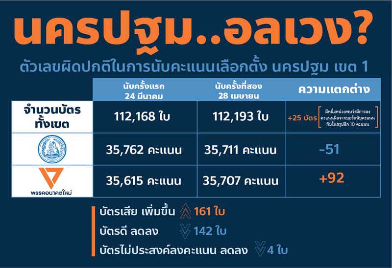 (1) จำนวนบัตรเลือกตั้งที่ใช้นับคะแนนมีจำนวนเพิ่มขึ้นในการนับครั้งที่ 2 ถึง 25 บัตร เป็นอย่างน้อย กล่าวคือ ในการเลือกตั้งเมื่อวันที่ 24 มีนาคมนั้น กกต. นครปฐมเขต 1 ประกาศว่า มีผู้มาใช้สิทธิ์เลือกตั้งจำนวน 112,168 คน แต่ในการนับคะแนนใหม่เมื่อวันที่ 28 เมษายน ปรากฏว่า ตามประกาศผลรวมคะแนนของ กกต. เขต 1 นครปฐม จำนวนบัตรเลือกตั้งที่ใช้นับคะแนนมี 112,183 บัตร เพิ่มขึ้นจากจำนวนผู้มาใช้สิทธิ์เลือกตั้งเมื่อวันที่ 24 มีนาคม ถึง 15 บัตร