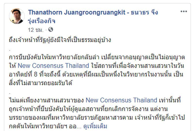 การบีบบังคับให้มหาวิทยาลัยกลับลำ เปลี่ยนจากอนุญาตเป็นไม่อนุญาตให้ New Consensus Thailand ใช้สถานที่เพื่อจัดงานสานเสวนาในวันอาทิตย์ที่ 8 ที่จะถึงนี้ ด้วยเหตุที่มีผมเป็นหนึ่งในวิทยากรในงานนั้น เป็นสิ่งที่ไม่สามารถยอมรับได้