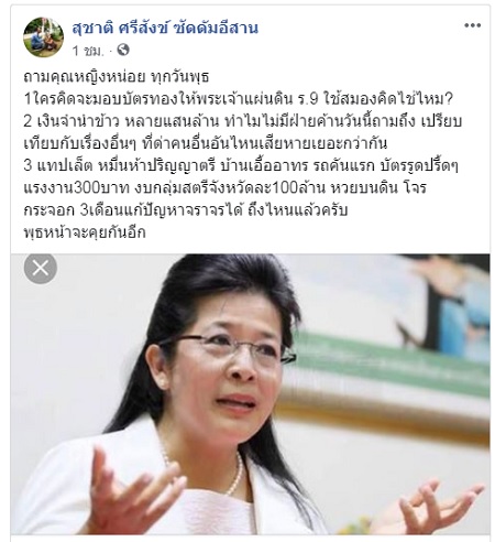 3 ตุลาคม 2562 นายสุชาติ ศรีสังข์ หรือ “ซัดดัมอีสาน” อดีต ส.ส.มหาสารคาม พรรคไทยรักไทย ซึ่งปัจจุบันเป็นสมาชิกพรรคภูมิใจไทย โพสต์ข้อความลงในเฟซบุ๊ก “สุชาติ ศรีสังข์ ซัดดัมอีสาน” มีเนื้อหาดังนี้