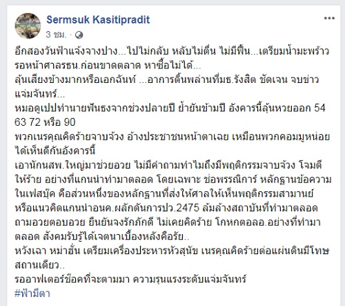 “อีกสองวันฟ้าแจ้งจางปาง...ไปไม่กลับ หลับไม่ตื่น ไม่มีฟื้น...เตรียมน้ำมะพร้าวรอหน้าศาล รธน.ก่อนขาดตลาด หาซื้อไม่ได้... ลุ้นเสียงข้างมากหรือเอกฉันท์ ...อาการดิ้นพล่านที่ มธ.รังสิต ชัดเจน จบข่าวแจ่มจันทร์...