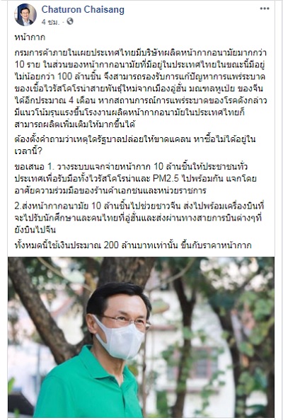 2 กุมภาพันธ์ 2563 นายจาตุรนต์ ฉายแสง อดีตประธานยุทธศาสตร์พรรคไทยรักษาชาติ (ทษช.) โพสต์ข้อความลงบนเฟซบุ๊ก Chaturon Chaisang หัวข้อ “หน้ากาก” ระบุว่า