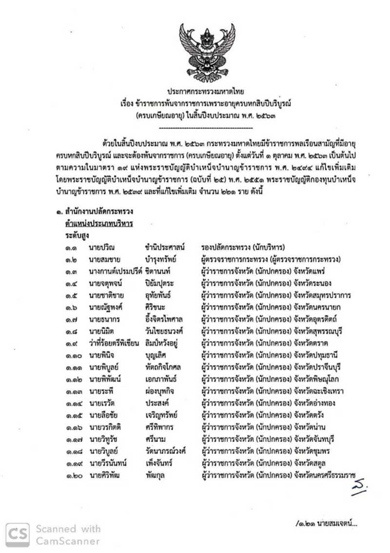 วันที่ 8 มิถุนายน 2563 ผู้สื่อข่าวรายงานว่า กระทรวงมหาดไทย ออกประกาศ เรื่อง ข้าราชการพ้นจากราชการเพราะอายุครบหกสิบปีบริบูรณ์ ในสิ้นปีงบประมาณ พ.ศ.2563 จำนวน 221 ตำแหน่ง มีตั้งแต่สำนักปลัดกระทรวง ประเภทบริหาร ทุกกรม ทั่วประเทศ
