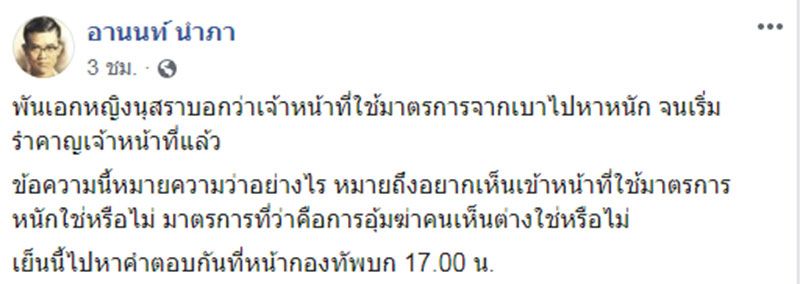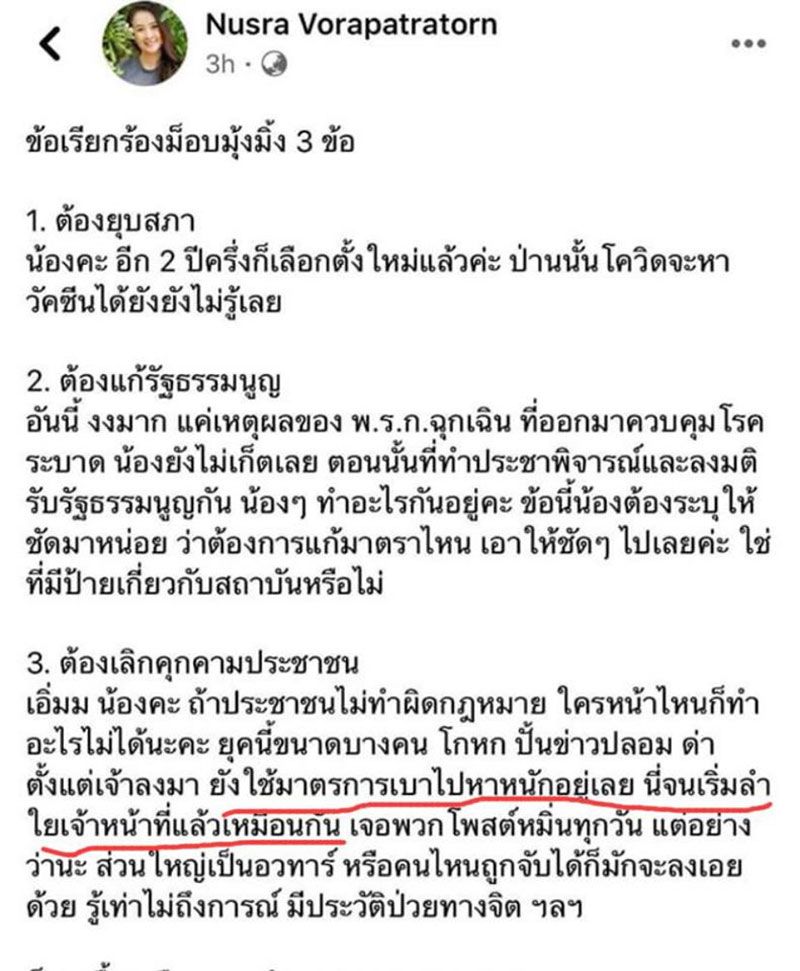 3. ต้องเลิกคุมคามประชาชน เอิ่ม น้องคะ ถ้าประชาชนไม่ทำผิดกฎหมาย ใครหน้าไหนก็ทำอะไรไม่ได้นะคะ ยุคนี้บางคนโกหก ปั้นข่าวปลอม ด่าตั้งแต่เจ้าลงมา ยังใช้มาตรการเบาไปหาหนักอยู่เลย จนเริ่มลำไยเจ้าหน้าที่แล้วเหมือนกัน เจอพวกโพสต์หมิ่นทุกวัน แต่อย่างว่านะ ส่วนใหญ่เป็นอวตาร หรือคนที่ถูกจับมักลงเอยด้วย รู้เท่าไม่ถึงการณ์ มีประวัติทางจิต ฯลฯ"