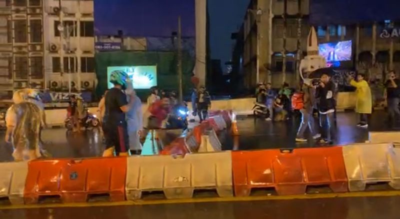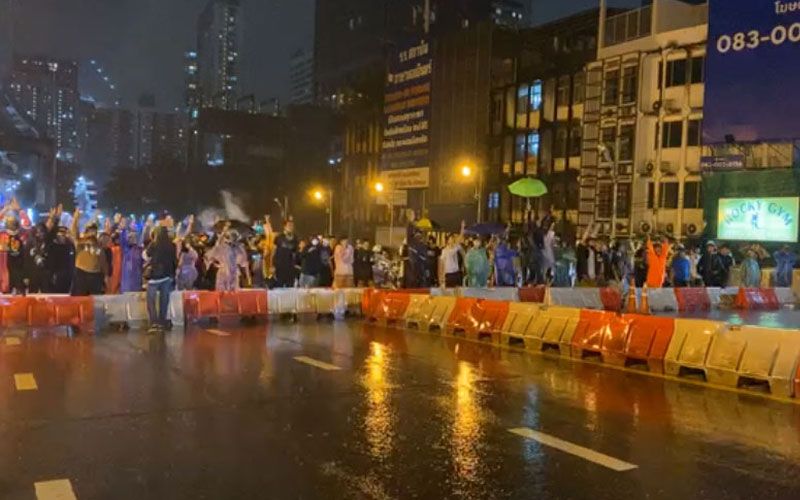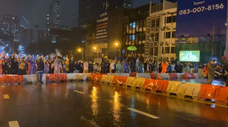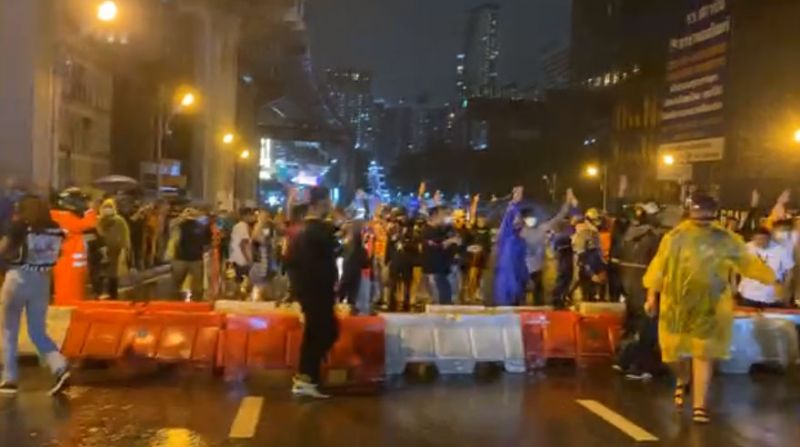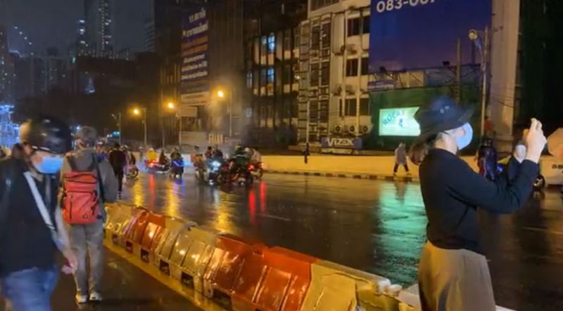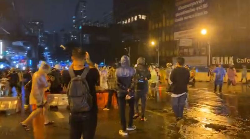 22.19 น. จนท.ฉีดน้ำใส่ผู้ชุมนุม ขณะที่ผู้ชุมนุมถอยร่นออกไปเกือบถึงแยกราชเทวี และมีการบีบแตรเป็นระยะ