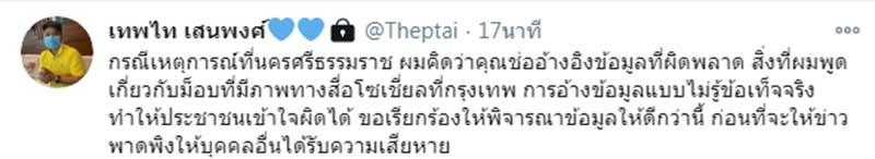 ล่าสุดนายเทพไท เสนพงศ์ ได้โพสต์ผ่านทวิตเตอร์ว่า "กรณีเหตุการณ์ที่นครศรีธรรมราช ผมคิดว่าคุณช่ออ้างอิงข้อมูลที่ผิดพลาด สิ่งที่ผมพูดเกี่ยวกับม็อบที่มีภาพทางสื่อโซเชี่ยลที่กรุงเทพ การอ้างข้อมูลแบบไม่รู้ข้อเท็จจริง ทำให้ประชาชนเข้าใจผิดได้ ขอเรียกร้องให้พิจารณาข้อมูลให้ดีกว่านี้ ก่อนที่จะให้ข่าวพาดพิงให้บุคคลอื่นได้รับความเสียหาย"