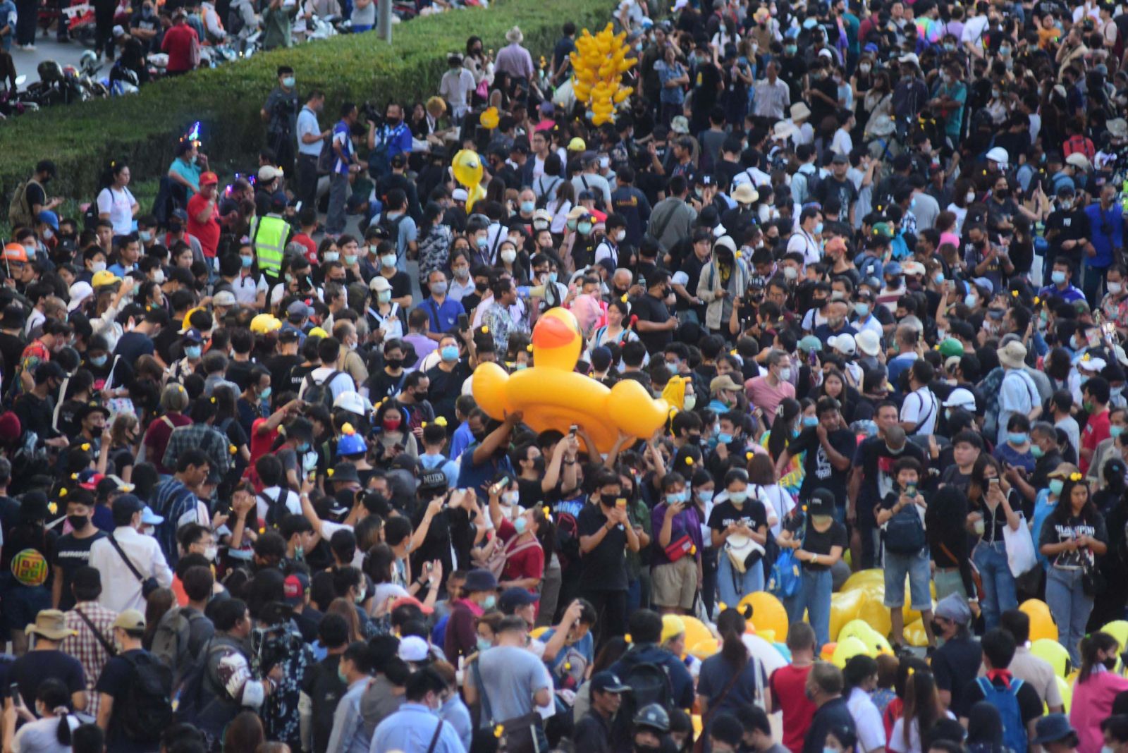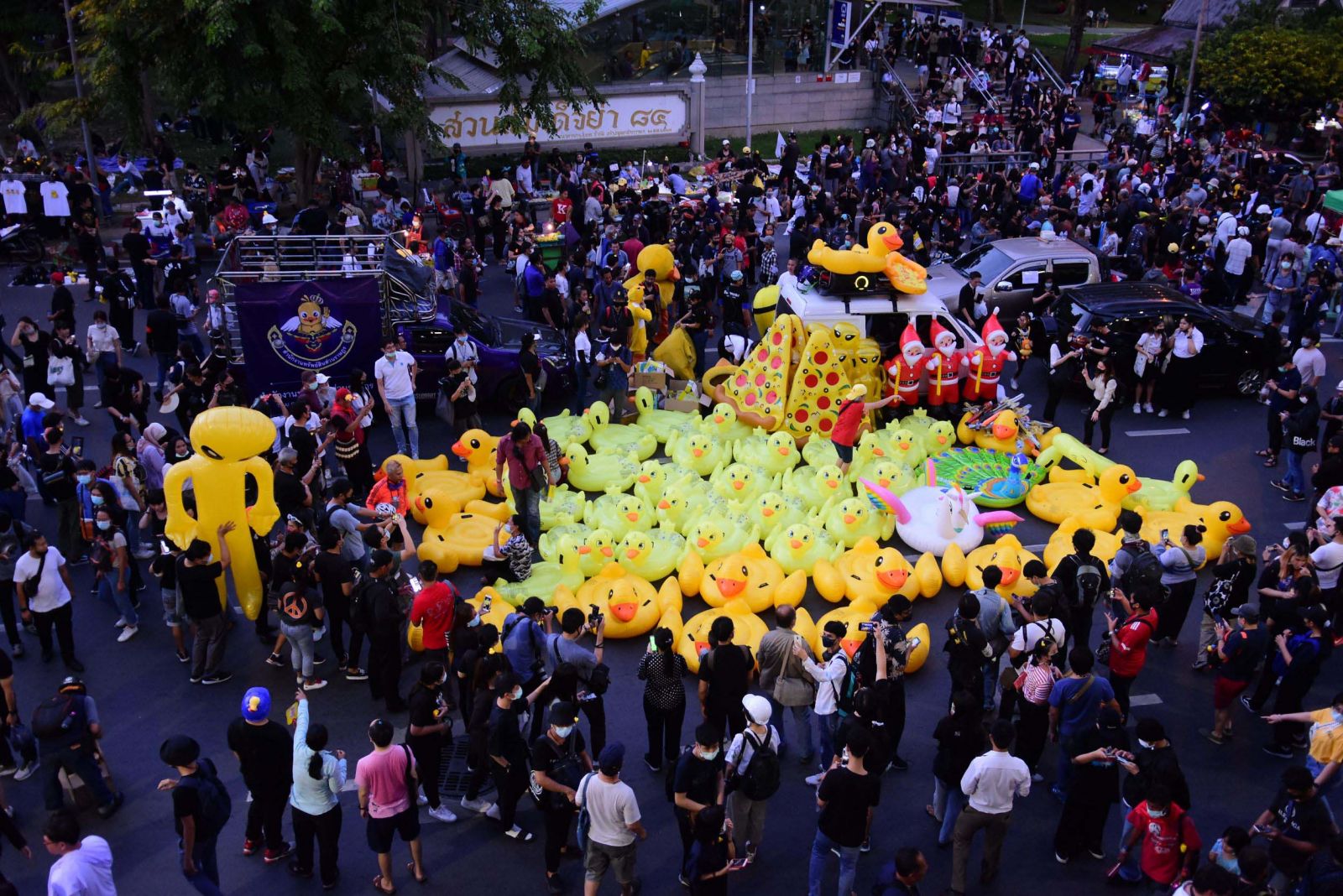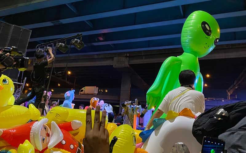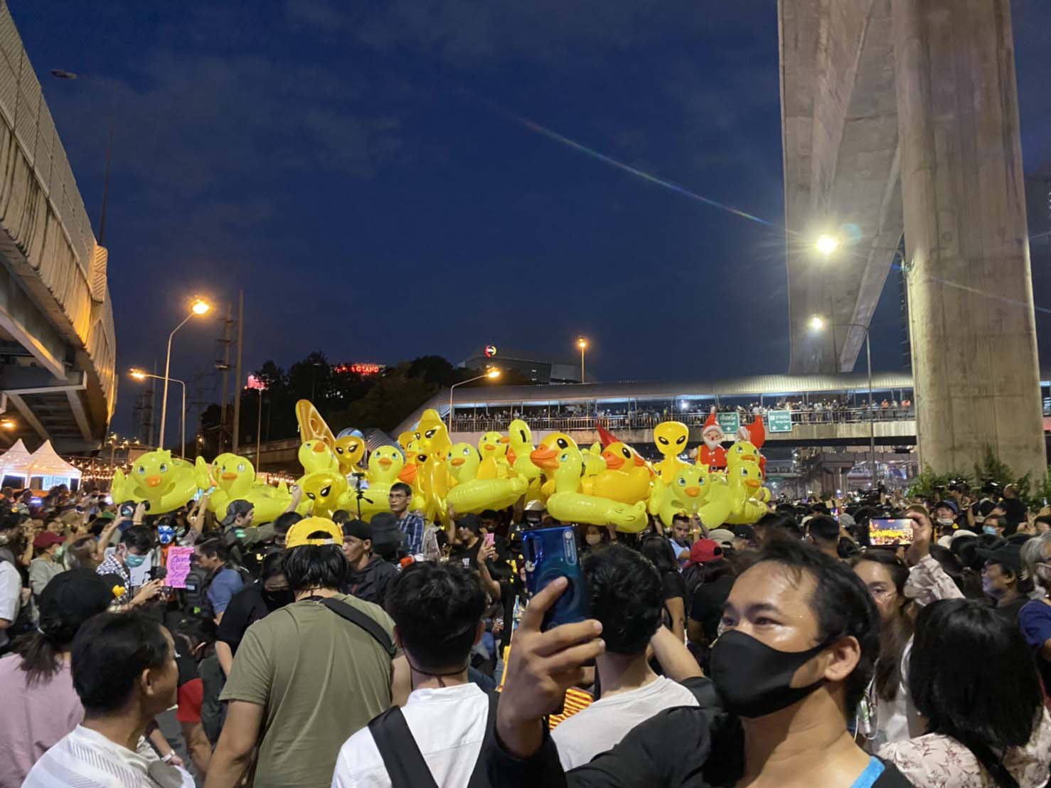 ม็อบเปิดแคมเปญปลุกมวลชนหึกเหิมซ้อมต้านรปห.จนกว่าจะสิ้นแผ่นดินไทย จำลองเปรียบ ‘เป็ดยาง-เอเลี่ยน’ เสมือน ‘ทหาร-รถถัง’ ส่งมากองหน้าเวทีล้อม-โห่ -ชู 3 นิ้ว