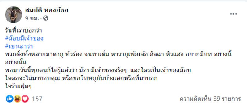 วันที่ 3 กุมภาพันธ์ 2564 นายสมบัติ ทองย้อย หัวหน้าการ์ดเสื้อแดง โพสต์เฟซบุ๊กระบุว่า วันที่เราบอกว่า ม็อบมีเจ้าของ เขาเล่าว่า พวกติ่งทั้งหลายมาด่ากู ทัวร์ลง จนท่าเต็ม หาว่ากูเพ้อเจ้อ อิจฉา หิวแสง อยากมีบท อย่างนี้ อย่างนั้น