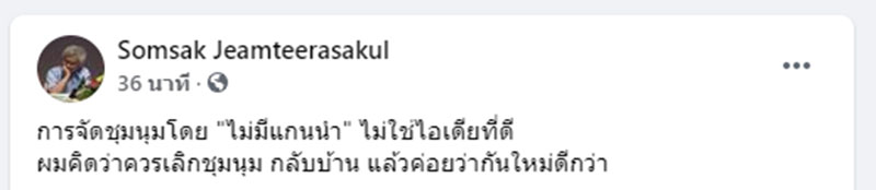 เมื่อวันที่ 28 กุมภาพันธ์ 2564 นายสมศักดิ์ เจียมธีรสกุล อดีตอาจารย์ประจำภาควิชาประวัติศาสตร์ มหาวิยาลัยธรรมศาสตร์ ผู้ลี้ภัยการเมืองในฝรั่งเศส ได้โพสต์ข้อความลงบนเฟซบุ๊กส่วนตัว "Somsak Jeamteerasakul" ระบุว่า "การจัดชุมนุมโดย "ไม่มีแกนนำ" ไม่ใช่ไอเดียที่ดี ผมคิดว่าควรเลิกชุมนุม กลับบ้าน แล้วค่อยว่ากันใหม่ดีกว่า"
