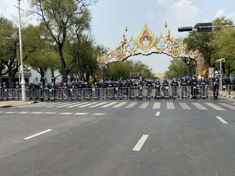 ขณะที่การดูแลความเรียบร้อยทางเจ้าหน้าที่ตำรวจ สน.ชนะสงคราม และ สน.สำราญราษฎร์ นำรถกระบะ รถตู้ ทั้งจากสถานีตำรวจนครบาล และ สถานีตำรวจภูธร พร้อมกำลังเจ้าหน้าที่ตำรวจทั้งในและนอกเครื่องแบบ ไปจนถึงตำรวจควบคุมฝูงชน (คฝ.) มาประจำการรอบบริเวณถนนราชดำเนินกลาง เจ้าหน้าที่บางส่วนนั่งพักภายในร้านกาแฟชาวดอย โดยมีการนำรั้วเหล็กมาปิดกั้นรอบอนุสาวรีย์ประชาธิปไตย และกรวยจราจรมาตั้งเป็นแนว บริเวณริมทางเท้า ตั้งแต่หน้าร้านแมคโดนัลด์ เพื่อกำหนดขอบเขตการทำกิจกรรม ส่วนบริเวณใกล้กับทำเนียบรัฐบาล ทางเจ้าหน้าที่ได้นำตู้คอนเทนเนอร์มากั้นไว้ที่บริเวณแยกจปร. เพื่อสกัดการเดินขบวนของกลุ่มดังกล่างอีกด้วย