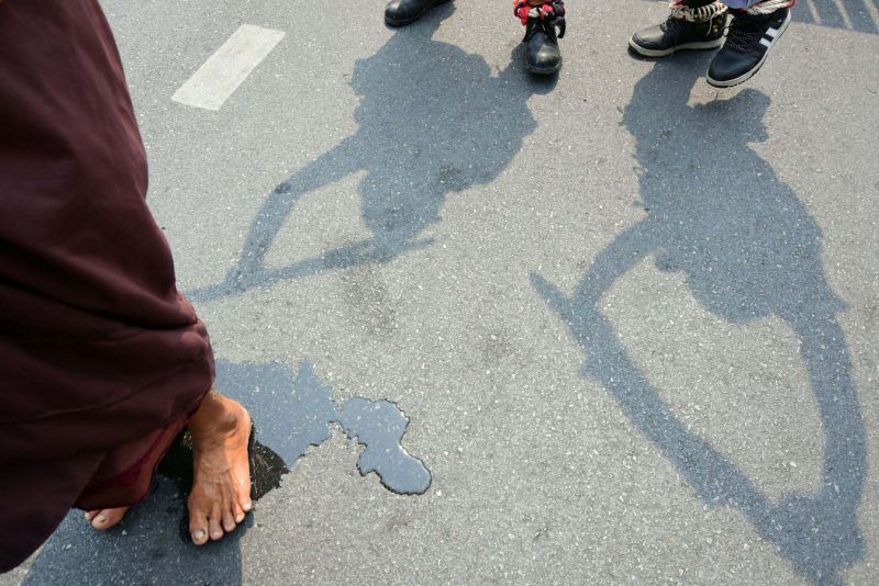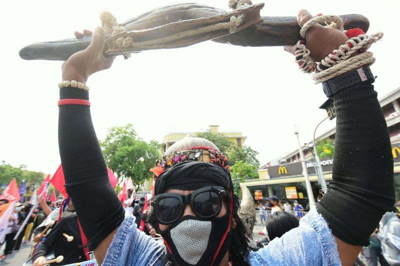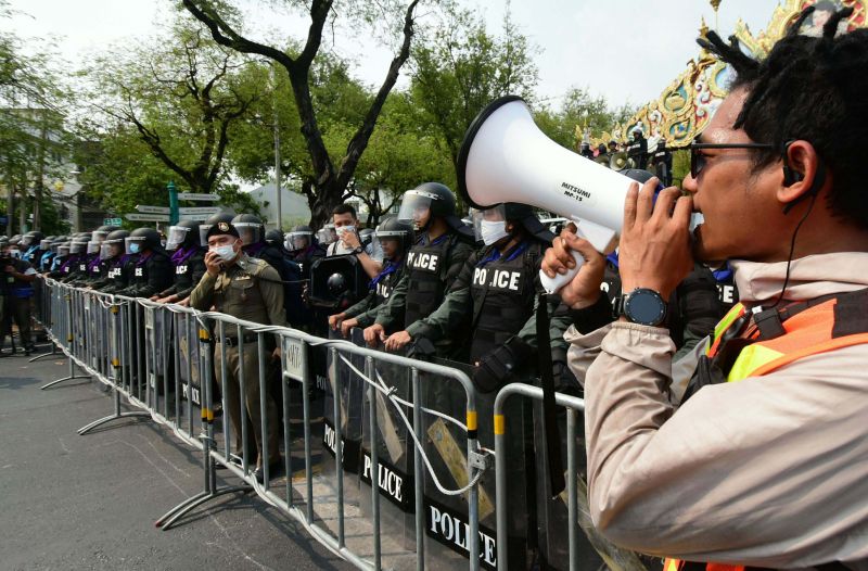 อย่างไรก็ตาม ขณะนี้กลุ่มผู้ชุมนุมได้เดินขบวนมาหยุดอยู่บริเวณแยกสะพานผ่านฟ้า โดยมีเจ้าหน้าที่ตำรวจควบคุมฝูงชนตั้งแนวพร้อมแผงกั้นสกัด ที่ถนนราชดำเนิน มุ่งหน้าทำเนียบรัฐบาล และพยายามเจรจาให้ผู้ชุมนุมเปลี่ยนไปใช้ถนนเส้นหลานหลวงในการเดินขบวน ซึ่งทางตัวแทนกลุ่มผู้ชุมนุมได้ประกาศผ่านเครื่องขยายเสียงว่า ไม่ต้องการให้มีการปะทะ หรือสลายการชุมนุม โดยจะชุมนุมอย่างสันติ และยอมเปลี่ยนเส้นทางมาใช้เส้นถนนหลานหลวงแทน ขณะที่บรรยากาศในการชุมนุม ผู้ชุมนุมได้เดินขบวน พร้อมตีกลอง และเครื่องเข้าจังหวะตลอดการเดินขบวน ท่ามกลางสภาพอากาศที่ร้อนอบอ้าว