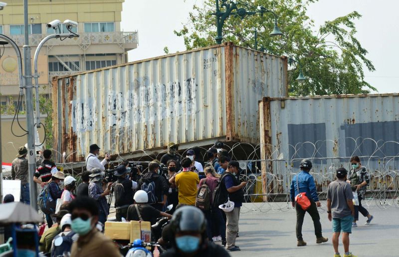 เวลา 14.55 น.หัวชบวนกลุุ่มผู้ชุมนุมได้เดินมาถึงสะพานชมัยมรุเชฐ โดยมีแท่งแบริเออร์ และลวดหีบเพลงขวางสกัด รวมทั้งตู้คอนเทนเนอร์ปิดเส้นทางไม่ให้ผู้ชุมนุมข้ามสะพาน โดยเจ้าหน้าที่ได้ยกตู้คอนเทนเนอร์มาเสริมด้านบนอีกหนึ่งชั้น