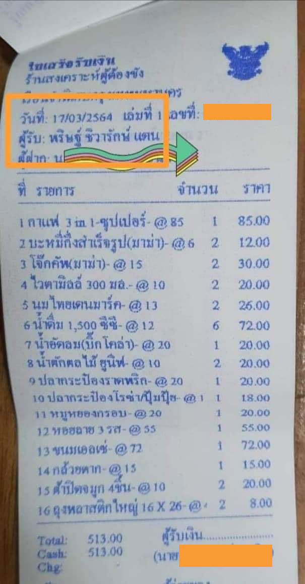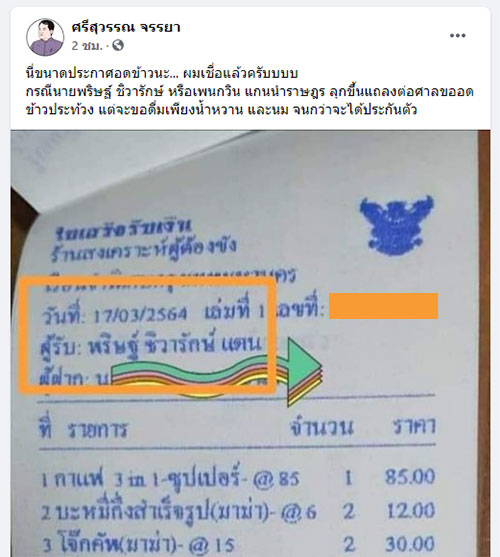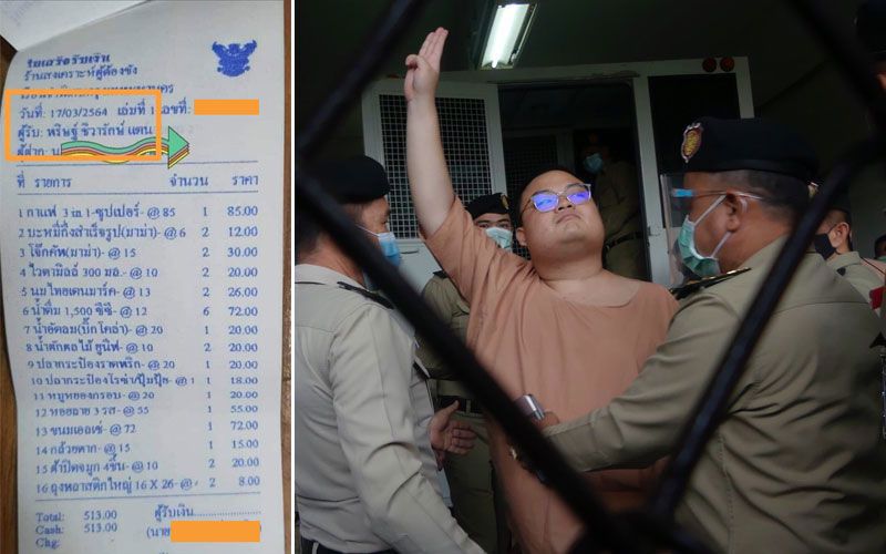 พร้อมกันนี้ ยังโพสต์รูปใบเสร็จรับเงิน ร้านสงเคราะห์ผู้ต้องขัง เรือนจำพิเศษกรุงเทพมหานคร ลงวันที่ 17 มีนาคม 2564 ชื่อผู้รับคือ พริษฐ์ ชิวารักษ์ ซึ่งเป็นช่วงเวลาเดียวกันที่นายพริษฐ์ประกาศอดข้าว