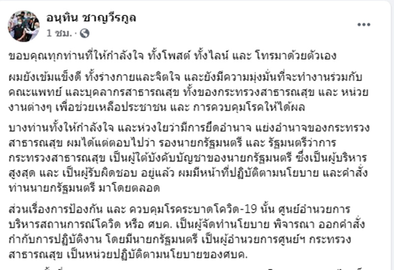 26 เมษายน 2564 นายอนุทิน ชาญวีรกูล รองนายกรัฐมนตรี และรมว.สาธารณาสุข โพสต์ผ่านเฟชบุ๊กภายหลังมีกระแสวิพากษ์วิจารณ์โจมตีการทำงานแก้ไขสถานการณ์โควิด-19 โดยระบุว่า ขอบคุณทุกท่านที่ให้กำลังใจ ทั้งโพสต์ ทั้งไลน์ และ โทรมาด้วยตัวเอง