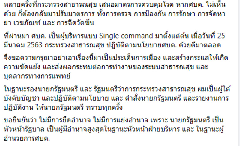ขอยืนยันว่า ไม่มีการยึดอำนาจ ไม่มีการแย่งอำนาจ เพราะนายกรัฐมนตรี เป็นหัวหน้ารัฐบาล เป็นผู้มีอำนาจสูงสุดในฐานะหัวหน้าฝ่ายบริหาร และในฐานะผู้อำนวยการ ศบค.
