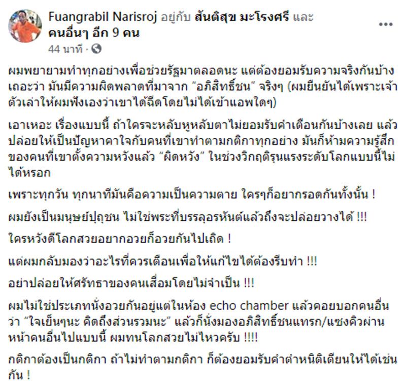 วันที่ 8 มิถุนายน 2564 นายนริศโรจน์ เฟื่องระบิล อดีตเอกอัครราชทูตไทย ได้โพสต์ข้อความลงในเฟซบุ๊ก Fuangrabil Narisroj ระบุว่า ผมพยายามทำทุกอย่างเพื่อช่วยรัฐมาตลอดนะ แต่ต้องยอมรับความจริงกันบ้างเถอะว่า มันมีความผิดพลาดที่มาจาก “อภิสิทธิ์ชน” จริงๆ (ผมยืนยันได้เพราะเจ้าตัวเล่าให้ผมฟังเองว่าเขาได้ฉีดโดยไม่ได้เข้าแอพใดๆ)