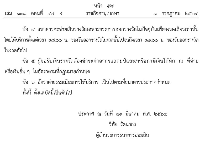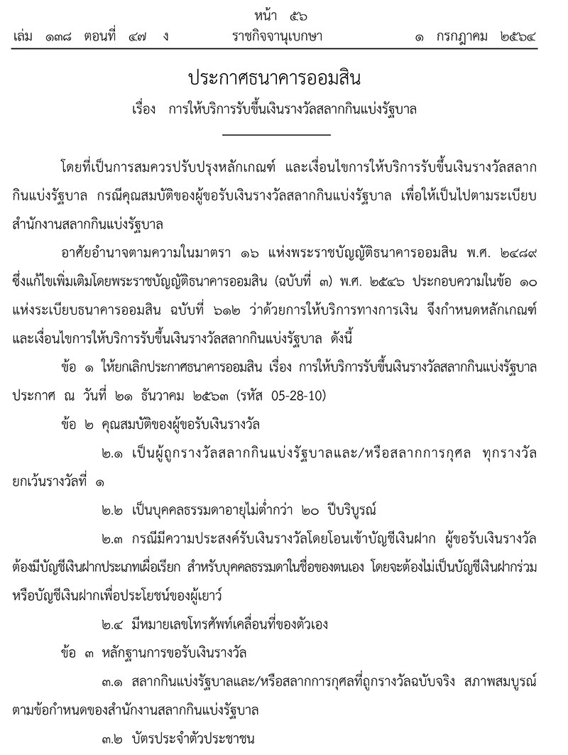 เมื่อวันที่ 1 กรกฎาคม 2564 เว็บไชต์ราชกิจจานุเบกษา ประกาศธนาคารออมสิน เรื่อง “การให้บริการรับขึ้นเงินรางวัลสลากกินแบ่งรัฐบาล” โดยที่เป็นการสมควรปรับปรุงหลักเกณฑ์ และเงื่อนไขการให้บริการรับขึ้นเงินรางวัลสลากกินแบ่งรัฐบาล กรณีคุณสมบัติของผู้ขอรับเงินรางวัลสลากกินแบ่งรัฐบาล เพื่อให้เป็นไปตามระเบียบสํานักงานสลากกินแบ่งรัฐบาล