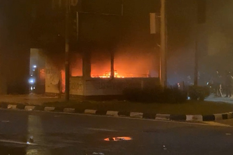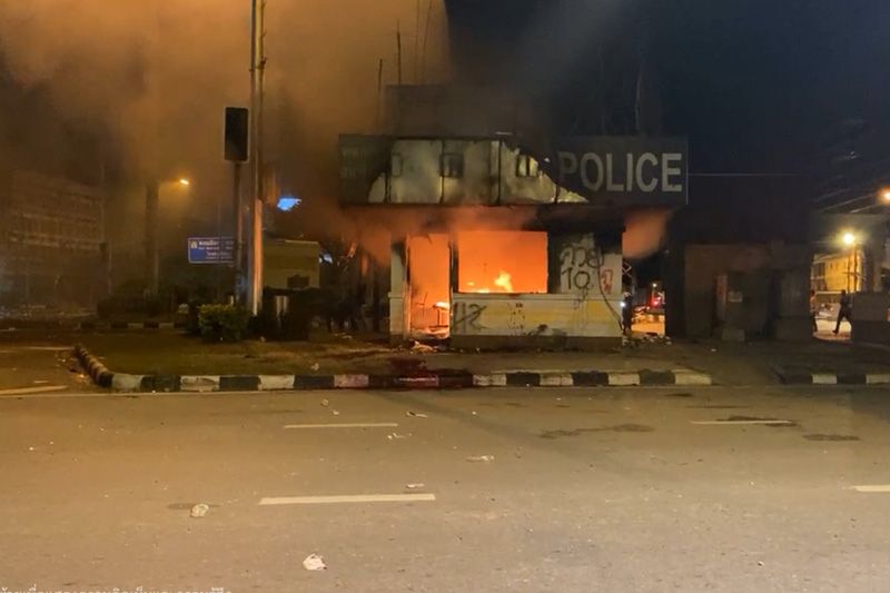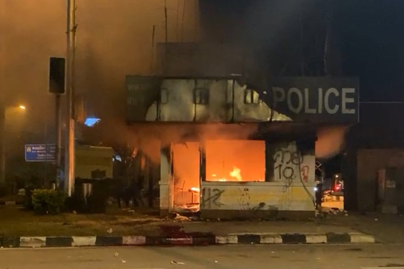 เมื่อวันที่ 15 สิงหาคม 2564 ผู้สื่อข่าวรายงานว่า เวลา 19.15 น.สถานการณ์บริเวณแยกดินแดงยังคงตรึงเครียด เมื่อกลุ่มผู้ชุมนุมที่เป็นกลุ่มอาชีวะยังคงปะทะกับเจ้าหน้าที่อยู่ตลอด ขณะเดียวกันป้อมควบคุมสัญญานจราจรของ สน.ดินแดง ที่ใต้ด่วนดินแดง ที่ถูกเผาไปเมื่อวันที่ 7 ส.ค.ที่ผ่านมา ที่ยังเหลือโครงสร้างอยู่ ยังไม่มีการรื้อโครงสร้างออก กลุ่มผู้ชุมนุมได้นำเก้าอี้พลาสติกของเจ้าหน้าที่ตำรวจที่นำมานั่งชั่วคราวในการอำนวยการจราจร พร้อมกันนั้นได้หาเศษขยะ ท่อนไม้หรือเชื้อเพลิงที่พอหาได้จุดไฟเผาซ้ำอีกรอบเจ้าหน้าที่ต้องเข้าระงับเหตุอีกครั้งโดยการยิงแก๊สน้ำตา ทำให้กลุ่มผู้ชุมนุมประกาศล่าถอยไปตั้งหลัก