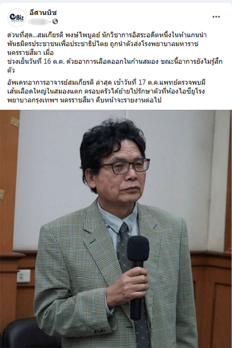 อัพเดทอาการอาจารย์สมเกียรติ ล่าสุด เช้าวันที่ 17 ต.ค.แพทย์ตรวจพบมีเส้นเลือดใหญ่ในสมองแตก ครอบครัวได้ย้ายไปรักษาตัวที่ห้องไอซียูโรงพยาบาลกรุงเทพฯ นครราชสีมา คืบหน้าจะรายงานต่อไป