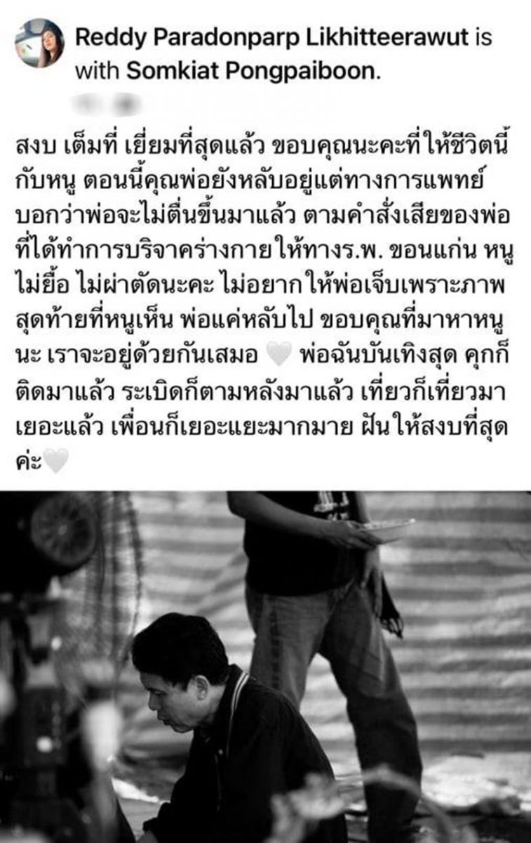"สงบ เต็มที่ เยี่ยมที่สุดแล้ว ขอบคุณนะคะที่ใช้ชีวิตนี้กับหนู ตอนนี้คุณพ่อยังหลับอยู่แต่ทางการแพทย์บอกว่าพ่อจะไม่ตื่นขึ้นมาแล้ว ตามคำสั่งเสียของพ่อที่ได้ทำการบริจาคร่างกายให้รพ. ขอนแก่น หนูไม่ยื้อ ไม่ผ่าตัดนะคะ ไม่อยากให้พ่อเจ็บเพราะภาพสุดท้ายที่หนูเห็นพ่อแค่หลับไป ขอบคุณที่มาหาหนู เราจะอยู่ด้วยกันเสมอ