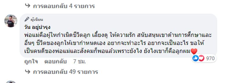 ก่อนที่ นายวัน อยู่บำรุง จะมาแสดงความเห็นว่า’พ่อแม่คือผู้ให้กำเนิดชีวิตลูก เลี้ยงดู ให้ความรัก สนับสนุนเขาด้านการศึกษาและอื่นๆ ชีวิตของลูกให้เขากำหนดเอง อยากจะทำอะไร อยากจะเป็นอะไร ขอให้เป็นคนดีของพ่อแม่และสังคมก็พอแล้วเพราะยังไง ยังไงเขาก็คือลูกผม’