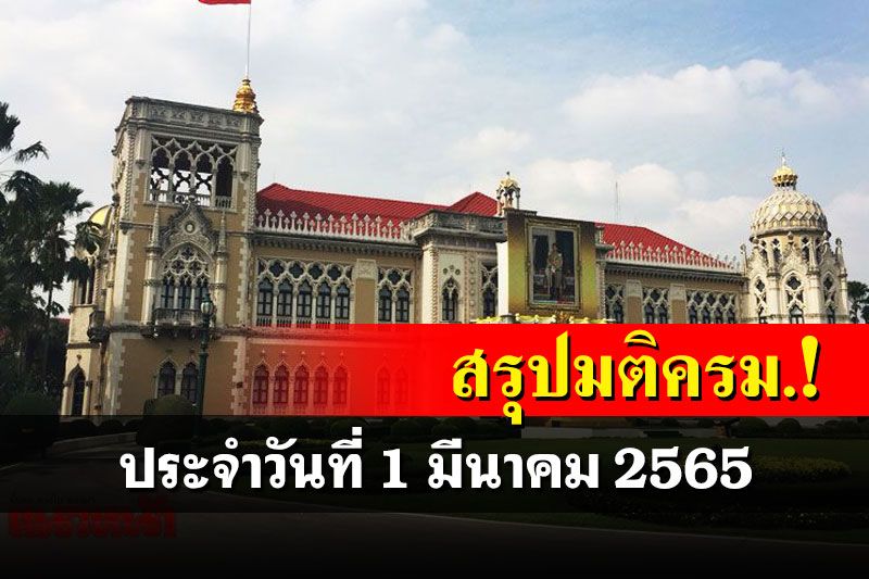 วันนี้ (1 มีนาคม 2565) เวลา 09.00 น. พลเอก ประยุทธ์ จันทร์โอชา นายกรัฐมนตรี เป็นประธานการประชุมคณะรัฐมนตรี ณ ตึกสันติไมตรี (หลังนอก) ทำเนียบรัฐบาล ซึ่งสรุปสาระสำคัญดังนี้