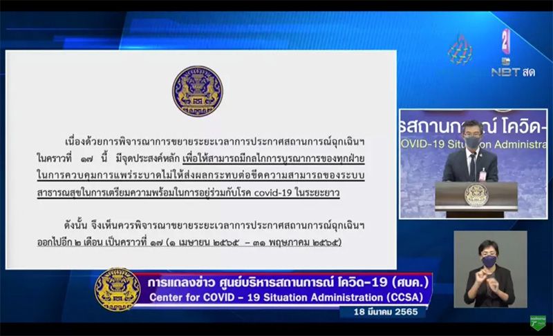 ประเด็นแรก ที่ประชุม ศบค. ขยายระยะเวลา ประกาศสถานการณ์ฉุกเฉินทั่วราชอาณาจักร (คราวที่ 17) ออกไปอีก 2 เดือน จากวันที่ 1 เม.ย.-31 พ.ค. 2565 เพื่อเอื้อต่อการบริหารจัดการด้านสาธารณสุข รวมถึงการบริหารจัดการการเดินทางสัญจรข้ามจังหวัด และการรวมกลุ่มทางสังคมของประชาชนในช่วงเทศกาลสงกรานต์