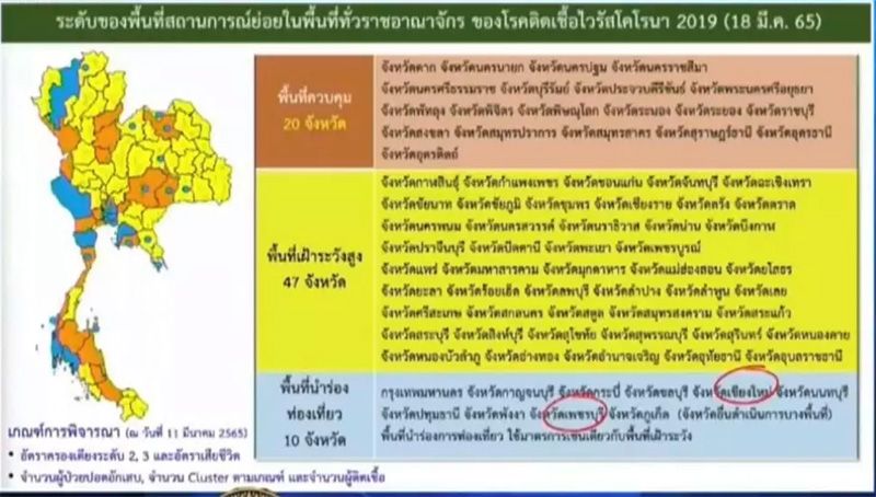 พื้นที่สีฟ้า 9 จังหวัด ได้แก่ กทม. กาญจนบุรี กระบี่ ชลบุรี นนทบุรี ปทุมธานี พังงา เพชรบุรี ภูเก็ต