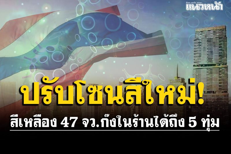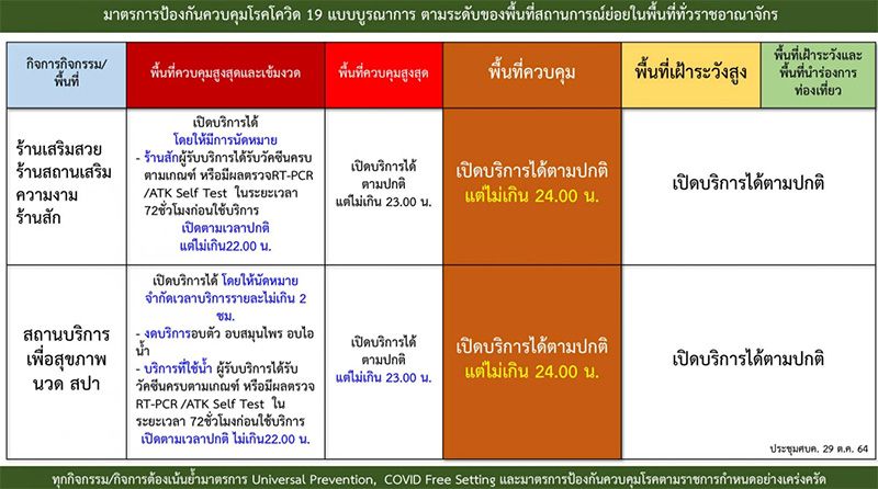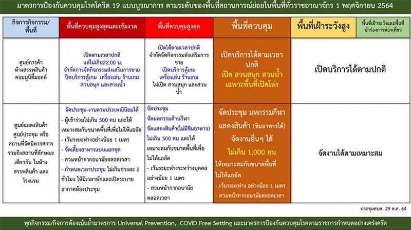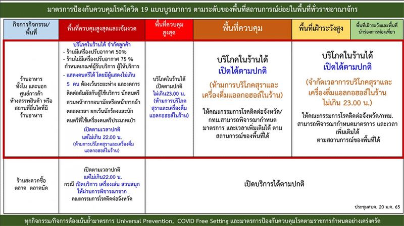 โดยพื้นที่สีส้ม อนุญาตให้ร้านอาหารทั้งในและนอกศูนย์การค้า ห้างสรรพสินค้า หรือสถานที่อื่นใดที่มีร้านอาหาร สามารถนั่งรับประทานในร้านได้ เปิดได้ตามปกติ แต่ห้ามดื่มเครื่องดื่มแอลกอฮอล์ในร้าน ส่วนพื้นที่สีเหลือง สามารถรับประทานอาหารในร้านได้ เปิดได้ตามปกติ ส่วนการดื่มเครื่องดื่มแอลกอฮอล์ในร้านจำกัดเวลาไม่เกิน 23.00 น.