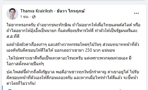 24 มีนาคม 2565 นายธันวา ไกรฤกษ์ อดีตสมาชิกพรรคพลังประชารัฐ (พปชร.) โพสต์เฟซบุ๊ก “Thanva Krairiksh - ธันวา ไกรฤกษ์” มีเนื้อหาดังนี้...