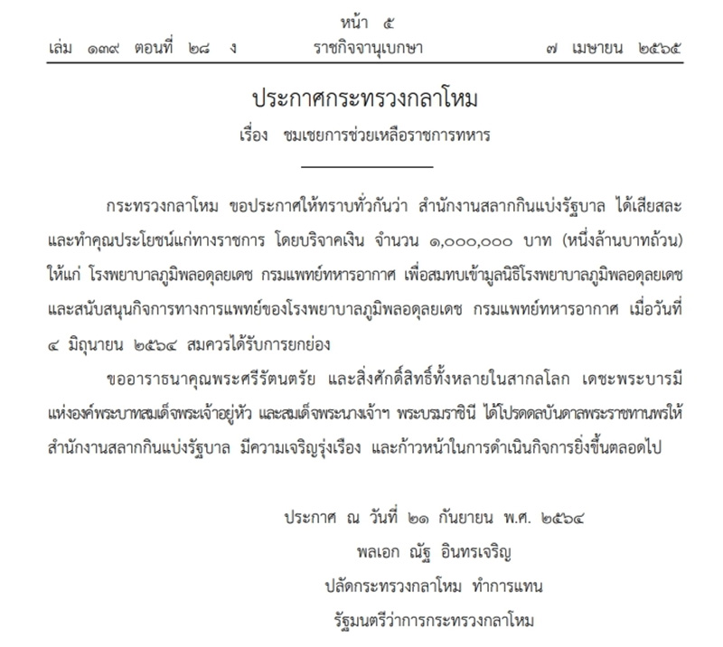 กระทรวงกลาโหม ขอประกาศให้ทราบทั่วกันว่า สํานักงานสลากกินแบ่งรัฐบาล ได้เสียสละและทําคุณประโยชน์แก่ทางราชการ โดยบริจาคเงิน จํานวน 1,000,000 บาท (หนึ่งล้านบาทถ้วน) ให้แก่ โรงพยาบาลภูมิพลอดุลยเดช กรมแพทย์ทหารอากาศ เพื่อสมทบเข้ามูลนิธิโรงพยาบาลภูมิพลอดุลยเดช และสนับสนุนกิจการทางการแพทย์ของโรงพยาบาลภูมิพลอดุลยเดช กรมแพทย์ทหารอากาศ เมื่อวันที่ 4 มิถุนายน 2564 สมควรได้รับการยกย่อง