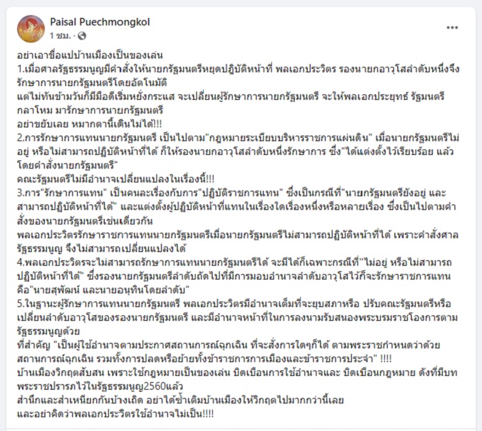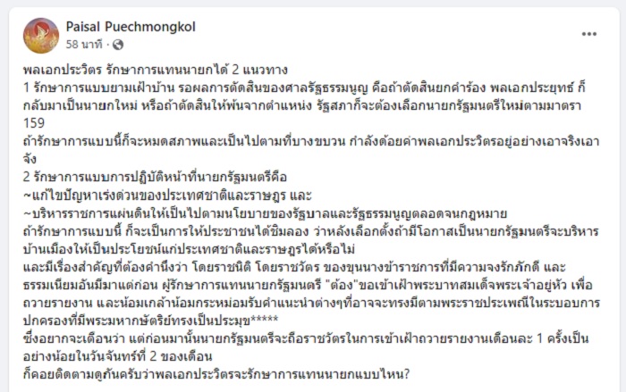 25 สิงหาคม 2565 นายไพศาล พืชมงคล อดีตกรรมการผู้ช่วยรองนายกรัฐมนตรี (พล.อ.ประวิตร วงษ์สุวรรณ) โพสต์ข้อความผ่านเฟซบุ๊ก Paisal Puechmongkol มีเนื้อหาดังนี้...