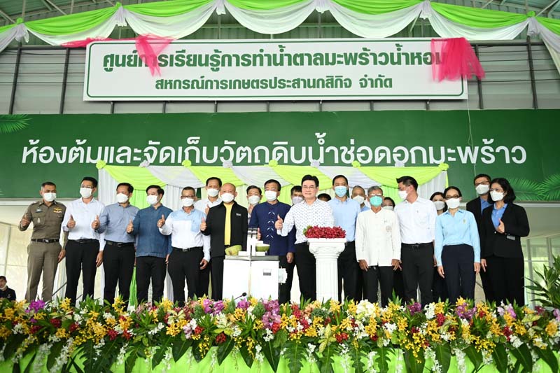“ต่อไปถ้าเราสามารถนำเกษตรพันธสัญญา พาผู้ซื้อผู้จำหน่ายมาทำสัญญาซื้อขายล่วงหน้าให้มีหลักประกันเรื่องราคาที่ชัดเจนจะยิ่งช่วยเพิ่มมูลค่าเพิ่มราคาให้กับผลผลิตทั้งมะพร้าวน้ำหอมบ้านแพ้ว ลำไยพวงทองบ้านแพ้ว และพืชเกษตรอื่นด้วย กระทรวงพาณิชย์และกระทรวงเกษตรฯยินดีมาช่วยสำหรับสหกรณ์การเกษตรประสานกสิกิจถือว่าเป็นสหกรณ์ตัวอย่างที่กรมส่งเสริมสหกรณ์ภาคภูมิใจ ก่อตั้งตั้งแต่วันที่ 25 ก.ค. 2484 ถือเป็นสหกรณ์ที่ยั่งยืนเพราะอยู่ได้จนถึงวันนี้ มีสมาชิก 268 คน ทุนปัจจุบัน 70 ล้านบาท และที่สำคัญมีโครงการศูนย์การเรียนรู้การทำน้ำตาลมะพร้าวน้ำหอม ถือเป็นอาชีพสำคัญสร้างรายได้ให้กับเกษตรกรและสมาชิกสหกรณ์ที่นี่” รองนายกรัฐมนตรีและรัฐมนตรีว่าการกระทรวงพาณิชย์กล่าว