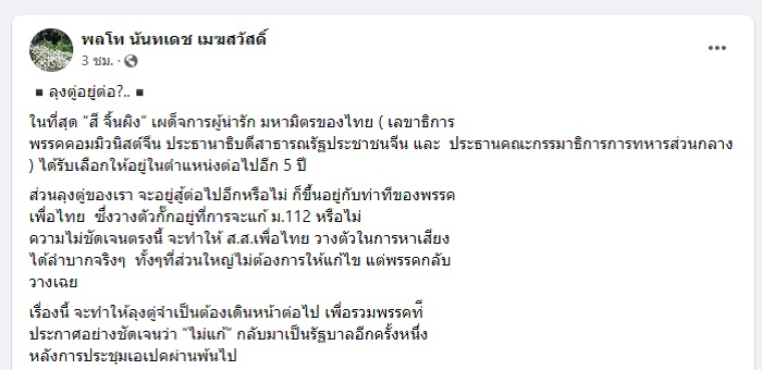 ส่วน ลุงตู่ ของเรา จะอยู่สู้ต่อไปอีกหรือไม่ ก็ขึ้นอยู่กับท่าทีของพรรคเพื่อไทย ซึ่งวางตัวกั๊กอยู่ที่การจะแก้ ม.112 หรือไม่