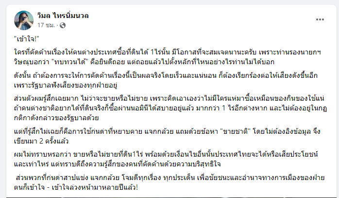 ผมไม่ทราบหรอกว่า ขายหรือไม่ขายที่ดิน 1 ไร่ พร้อมด้วยเงื่อนไขอื่นนั้น ประเทศไทยจะได้หรือเสียประโยชน์ และเท่าไหร่ แต่ทราบดีถึงความรู้สึกของคนที่คัดค้านด้วยความบริสุทธิ์ใจ
