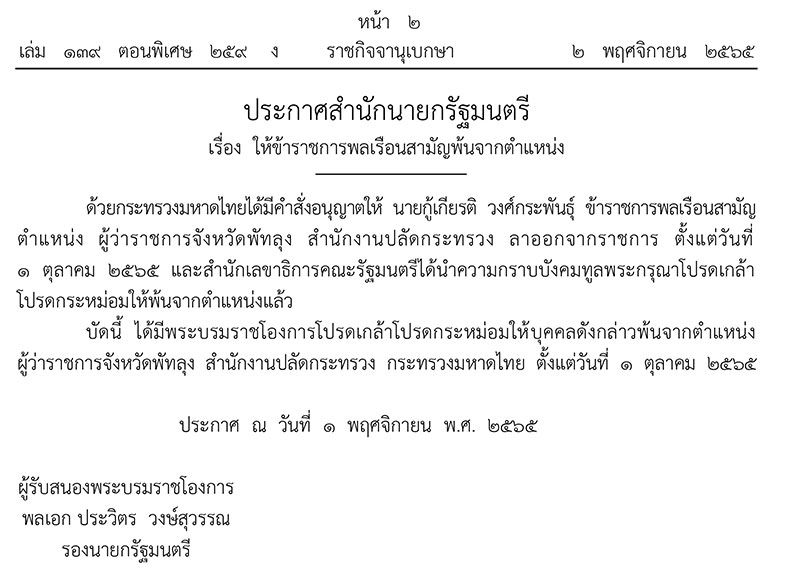 บัดนี้ ได้มีพระบรมราชโองการโปรดเกล้าโปรดกระหม่อมให้บุคคลดังกล่าวพ้นจากตำแหน่ง "ผู้ว่าราชการจังหวัดพัทลุง" สำนักงานปลัดกระทรวง กระทรวงมหาดไทย ตั้งแต่วันที่ 1 ตุลาคม 2565
