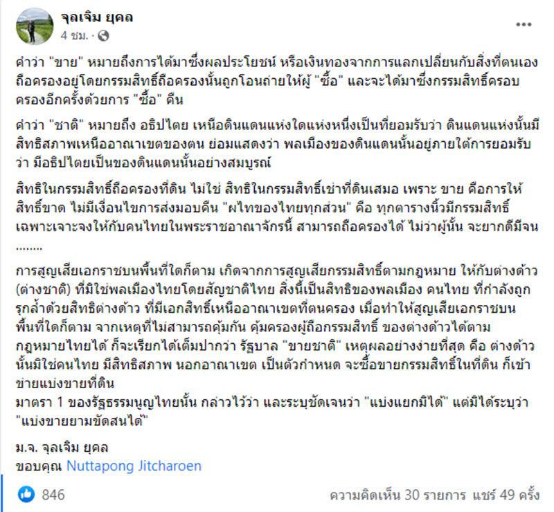 วันที่ 3 พฤสจิกายน 2565 มจ.จุลเจิม ยุคล หรือ "ท่านใหม่" โพสต์เฟซบุ๊ก ระบุว่า คำว่า "ขาย" หมายถึงการได้มาซึ่งผลประโยชน์ หรือเงินทองจากการแลกเปลี่ยนกับสิ่งที่ตนเองถือครองอยู่โดยกรรมสิทธิ์ถือครองนั้นถูกโอนถ่ายให้ผู้ "ซื้อ" และจะได้มาซึ่งกรรมสิทธิ์ครอบครองอีกครั้งด้วยการ "ซื้อ" คืน
