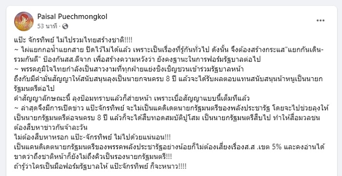 28 พฤศจิกายน 2565 นายไพศาล พืชมงคล อดีตกรรมการผู้ช่วยรองนายกรัฐมนตรี (พล.อ.ประวิตร วงษ์สุวรรณ) และนักกฎหมาย โพสต์ข้อความผ่านเฟซบุ๊ก Paisal Puechmongkol เกี่ยวกับสถานการณ์ทางการเมือง มีเนื้อหาดังนี้...