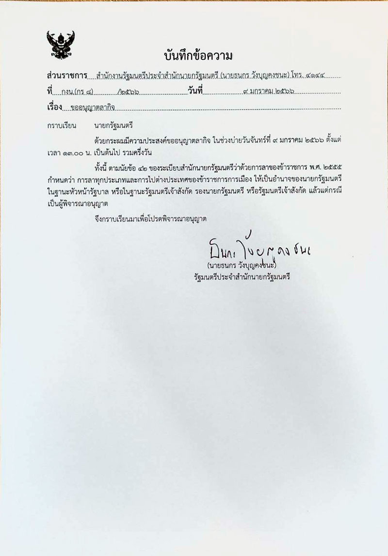 เมื่อวันที่ 9 มกราคม 2566 ผู้สื่อข่าวรายงานว่า นายธนกร วังบุญคงชนะ รัฐมนตรีประจำสำนักนายกรัฐมนตรี ได้ทำหนังสือ ขออนุญาตลากิจ ในช่วงบ่ายวันจันทร์ที่ 9 มกราคม 2566 ตั้งแต่เวลา 13.00 น.เป็นต้นไป รวมครึ่งวัน