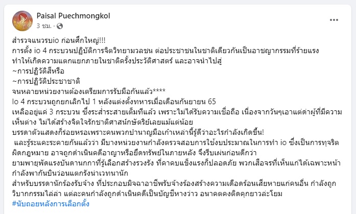 การตั้ง io 4 กระบวนปฏิบัติการจิตวิทยามวลชน ต่อประชาชนในชาติเดียวกันเป็นอาชญากรรมที่ร้ายแรง ทำให้เกิดความแตกแยกภายในชาติครั้งประวัติศาสตร์ และอาจนำไปสู่