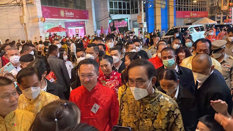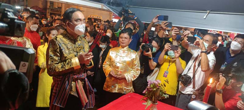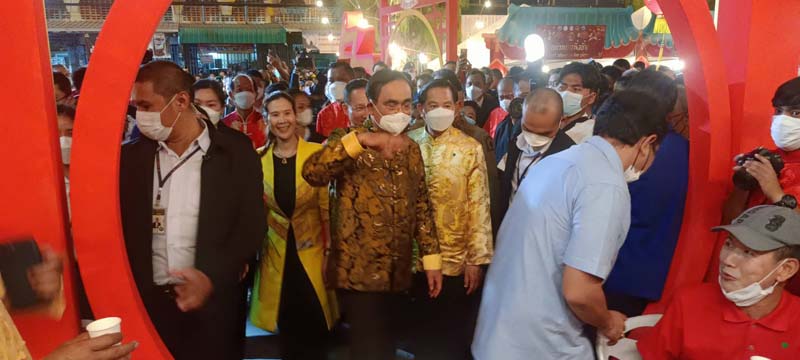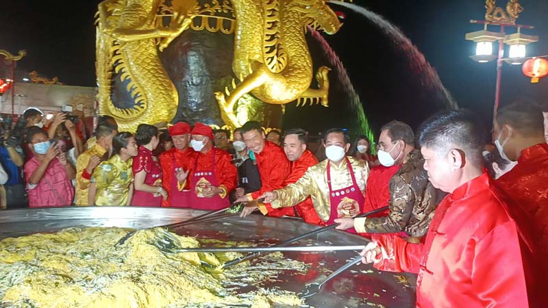 ต่อมา พล.อ.ประยุทธ์ แวะมาชมการแสดงงิ้วอย่างสนใจ ก่อนจะเดินมาไหว้ศาลเทพเจ้า 9 องค์ และไปยังจุดโอ่งมังกรพ่นน้ำ ซึ่งถือเป็นแลนด์มาร์คแห่งใหม่ เพื่อร่วมกับรัฐมนตรีผัดหมี่มงคล (หมี่ซั่ว) กะทะยักษ์ ซึ่งมีเส้นผ่าศูนย์กลาง 2.5 เมตร ทั้งนี้ พล.อ.ประยุทธ์ ได้เดินเข้าไปทักทายประชาชนที่กำลังข้าวในร้านข้าวต้มซุ่ยฮ้อเฮียโต ก่อนเดินทางกลับ กทม.