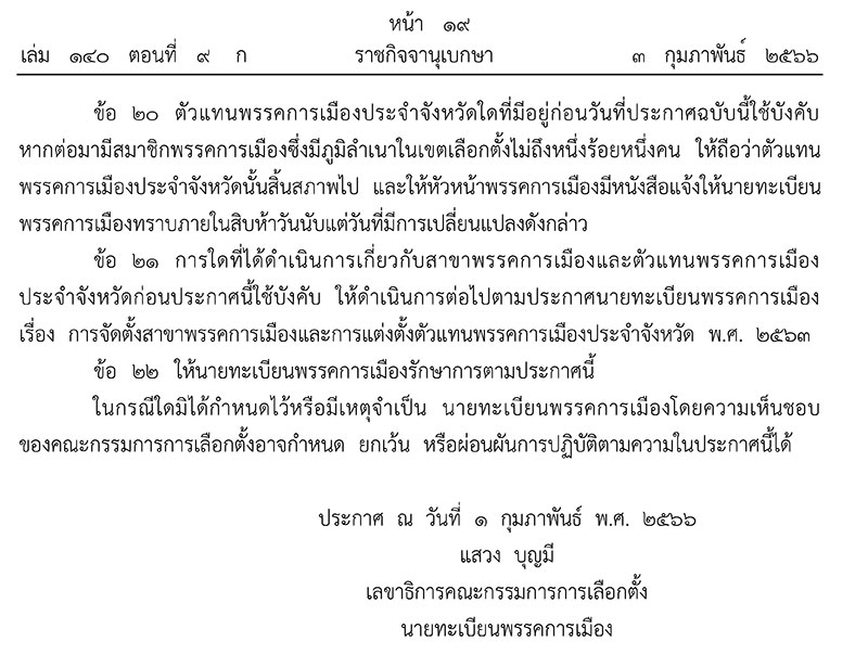 และในวันเดียวกัน เว็บไซต์ราชกิจจานุเบกษา เผยแพร่ประกาศนายทะเบียนพรรคการเมือง เรื่อง การจัดตั้งสาขาพรรคการเมืองและการแต่งตั้งตัวแทนพรรคการเมืองประจำจังหวัด พ.ศ.2566 ระบุว่า โดยที่เป็นการสมควรปรับปรุงประกาศนายทะเบียนพรรคการเมือง เรื่อง การจัดตั้งสาขาพรรคการเมืองและการแต่งตั้งตัวแทนพรรคการเมืองประจำจังหวัด พ.ศ.2563