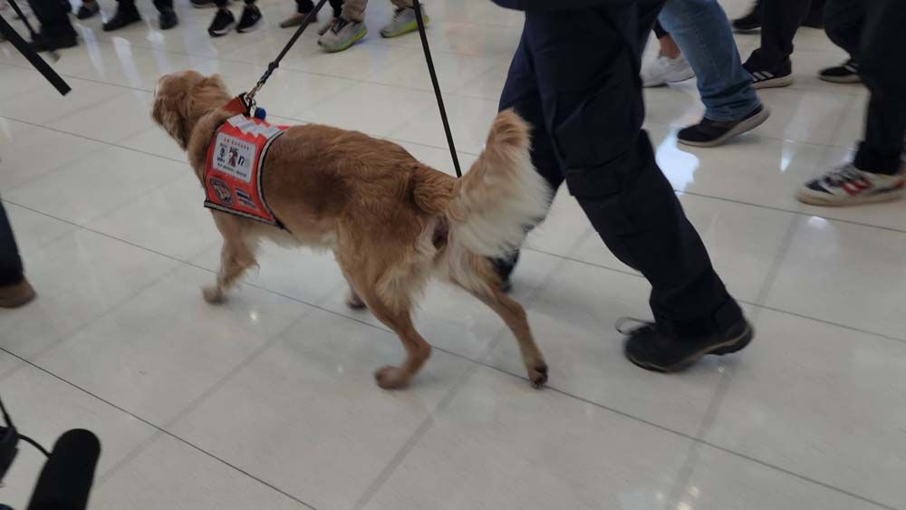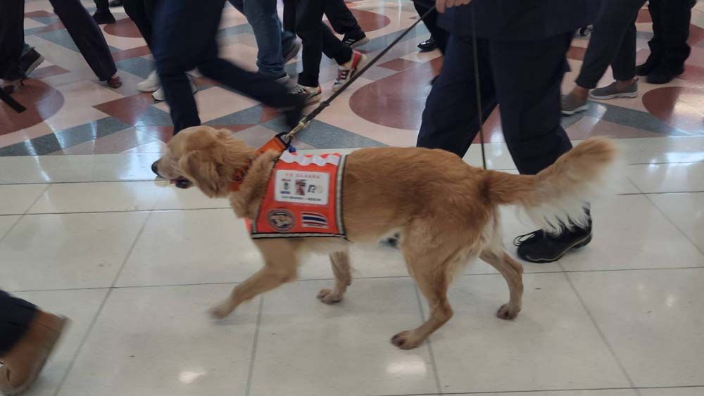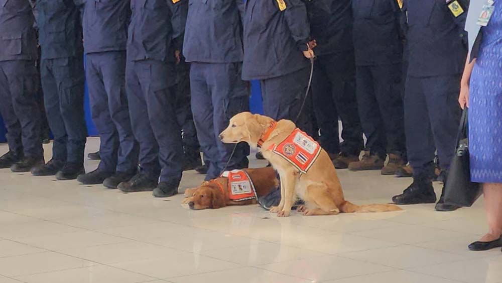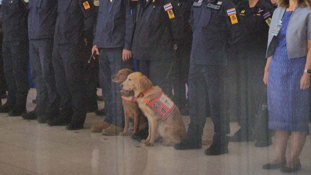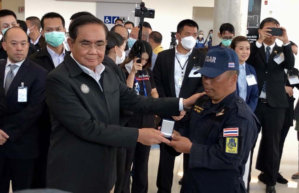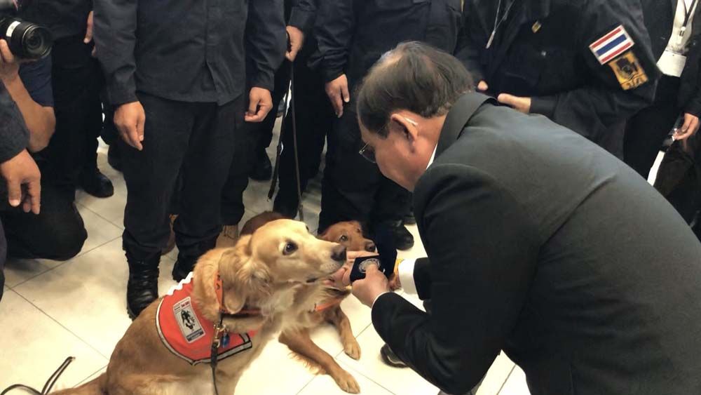 นายกฯยังกล่าวหยอกด้วยว่า แฟนคงรออยู่บ้านอย่าเพิ่งไปเที่ยวไหนก็แล้วกัน และกล่าวชื่นชมสุนัขทั้ง 2 ตัวว่าน่ารัก สงบเงียบเรียบร้อย ทั้งหมดเทียบได้ว่านี่คือวีรบุรุษเหมือนกัน ขอให้ทุกคนปรบมือให้กับเขาอีกครั้ง ตนขอชื่นชมยกย่องในความเสียสละของทุกท่าน ขอให้สิ่งศักดิ์สิทธิ์ทั้งหลายที่ท่านเคารพนับถือสุขภาพร่างกายที่แข็งแรง พัฒนาตนเองและหน่วยงานให้มีความพร้อมในการปฏิบัติภารกิจด้านการป้องกันและบรรเทาสาธารณภัย สร้างความปลอดภัยให้พี่น้องประชาชนและประเทศชาติต่อไป